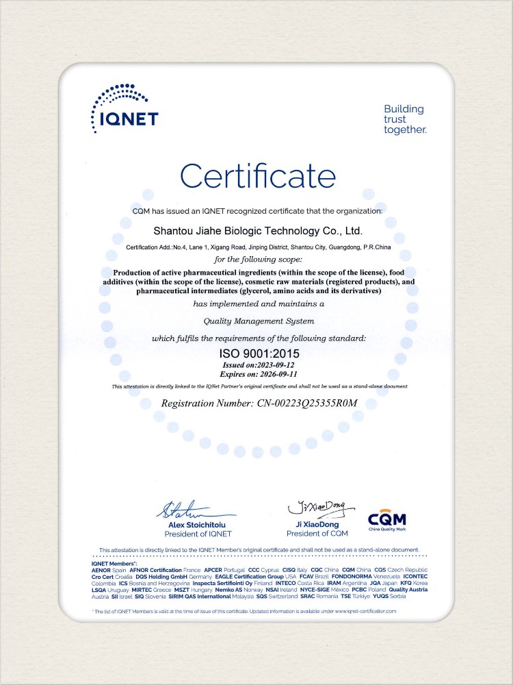 汕頭佳禾生物科技有限公司是一家致力于氨基酸及其衍生物研發、生產和銷售的國家高新技術企業,先后通過了國家藥品GMP認證,ISO9001質量體系認證、ISO14001環境管理體系認證。目前,公司擁有“廣東省專精特新中小企業”、“廣東省氨基酸產品工程技術研究中心”、“汕頭市生物發酵工程技術研究開發中心”、“汕頭市知識產權優勢企業”、“多項國家發明專利”、“廣東省守合同重信用企業”等多項資質和榮譽,旗下“佳禾牌”系列產品已成為原料藥行業知名品牌。 新泰市佳禾生物科技有限公司成立于2012年8月,注冊資金2億元,公司位于山東泰安新泰市新汶工業園區,是國 家級高新技術企業、山東省“專精特新”企業、山東省制造業單項冠軍企業、泰安市科技型中小企業、泰安市農業產業化龍頭企業、中國生物發酵產業協會理事單位。